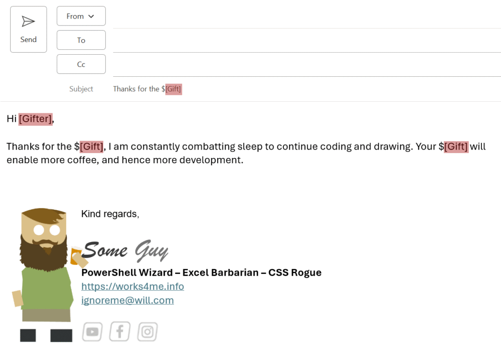 This is the easy part, just build an email then opt to Save As the message, as a template (*.oft). This is the example of the one used by the code. You’ll see three uses of [Gift] and one of the [Gifter] target words.